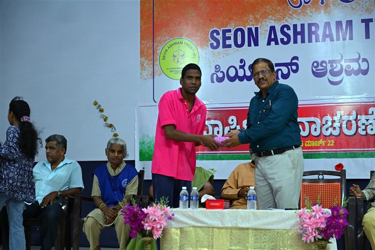 A walking assistance equipment is handed over to Deekshit S/O L Dev. . .